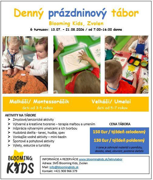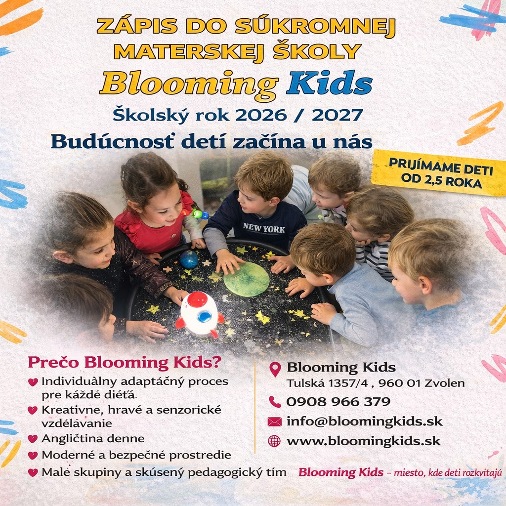Súkromnú materskú školu Blooming Kids sme otvorili na jeseň 2022 pre Vás a Vaše deti vo veku od 2 do 6 rokov. V Blooming Kids vyučujeme jazykom slovenským s denným obohatením o anglický jazyk.